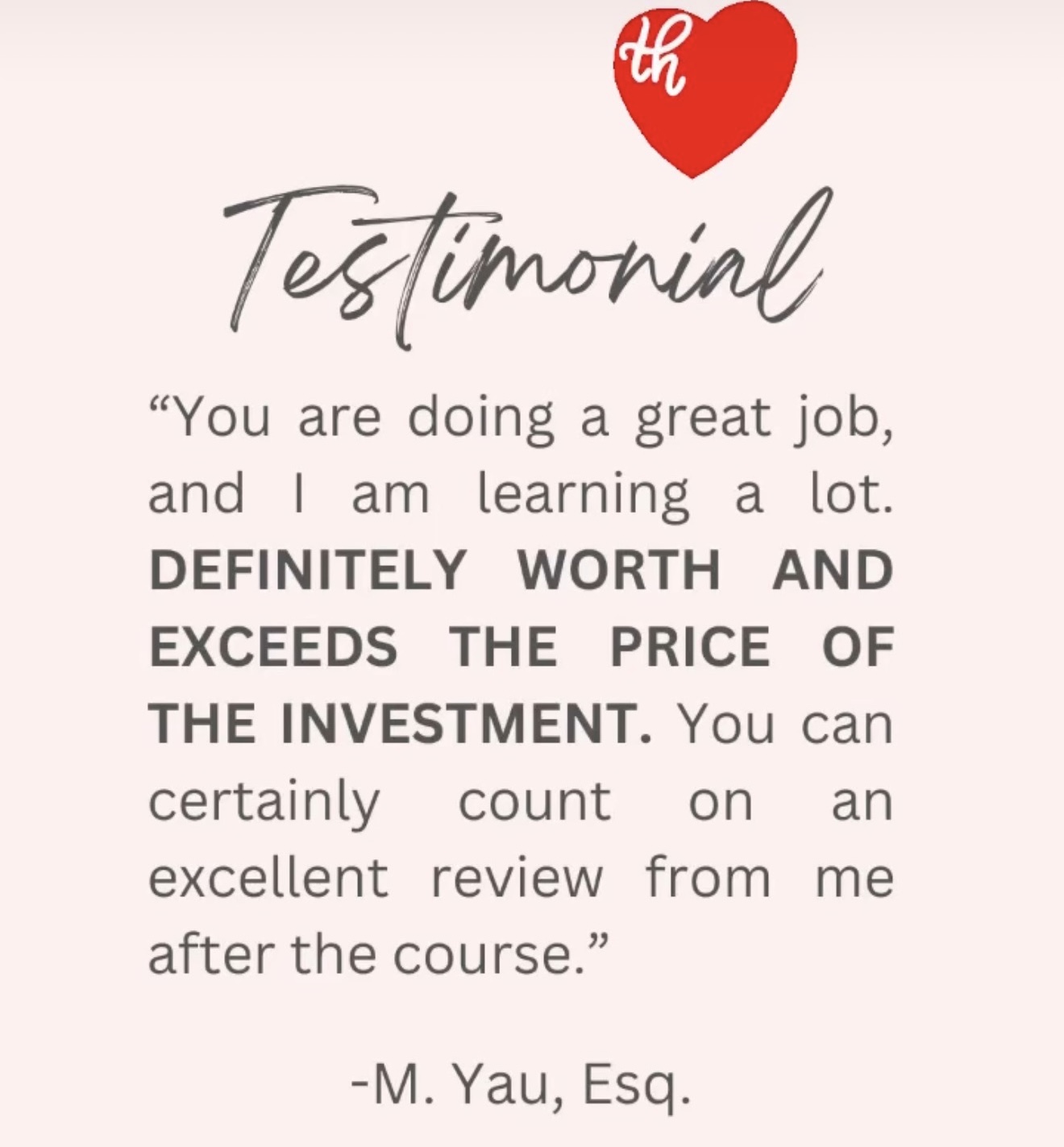 I simply cannot say enough good things about the class, and about Laura as a coach. To say the modules were thorough and comprehensive is an understatement. It was obvious to me after my first meeting with Laura that she is genuinely invested in her students. Perhaps most importantly, the 2HLL course is very reasonably priced. If you are on the fence about signing up for 2HLL, do it!